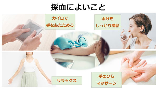 おふろから上がったあとは血行が良くなるので血管が浮き出て見えるという経験があると思います。反対に手先が冷たい場合や緊張すると血管が縮まって血管が見えにくくなります。カイロで手のひらを温めたり,手のひらをこすり合わせてマッサージしたりすると血管が見えやすくなります。また,採血の前に水分補給をすると血液の流れが良くなり血管は見えやすくなることがあります。