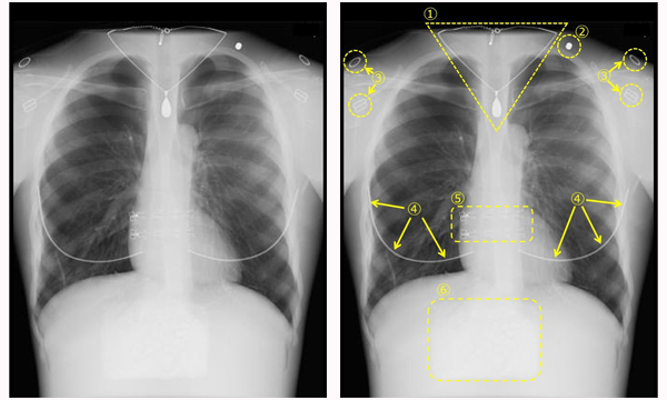 X線撮影では,X線が透過しやすいものほど黒く写り,透過しにくいものほど白く写ります。例えば空気を多く含んでいる肺はX線を透過しやすいので黒く写り,骨はX線を透過しにくいので白く写ります。医師はこの白黒の濃淡の差などを見て画像診断(読影)を行います。X線が透過しにくい素材の服装や装飾は,画像に白く写り込んでしまうためX線撮影時には適しません。