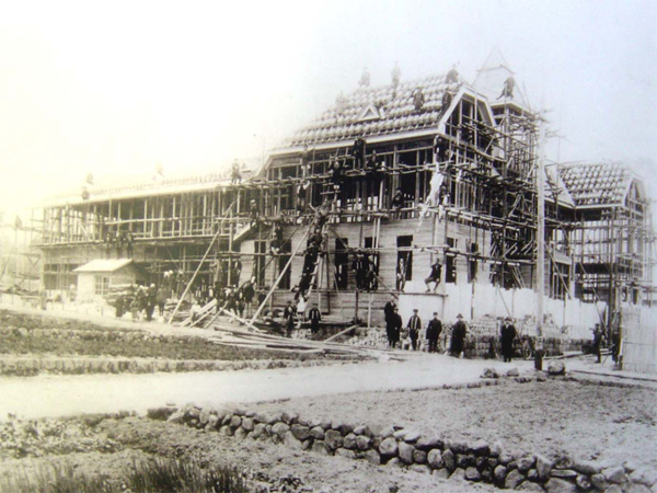 東側に尖塔屋根を軸とする左右対称のファサードを持ち,背面に2列に棟が伸び,中庭を囲む構成をとる。グレーのモルタルススペイン壁の上部に白漆喰のハーフティンバーがのる外壁に特徴があり,まちなみ景観のシンボルとして親しまれている。