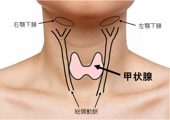 甲状腺は首の前面に張り付くように存在しており,上の図は女性の甲状腺の位置ですが,男性の甲状腺は鎖骨に近くやや下方に位置しています。男女に限らず鎖骨の奥まで観察するため首を伸展していただいて検査を行います。