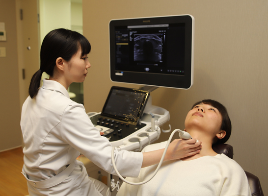 頸部エコー検査で観察する範囲は甲状腺や副甲状腺だけでなく,上は唾液腺から下は鎖骨辺りまで,左右は総頸動脈とその外側のリンパ節なども観察しています。その他,患者様の首の気になるところや痛みを伴うところがあれば,検査時に技師へお伝えください。あわせて観察していきます。