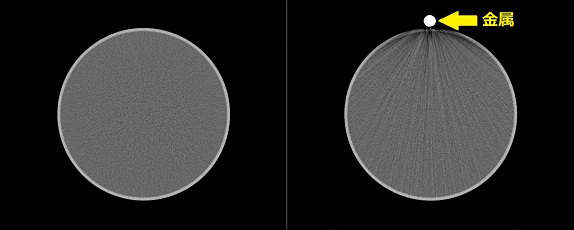 金属類の周りに黒い帯状の筋のように見えるものが金属アーチファクトです。図2では黄色い矢印で挟まれた部分(→ ←)に現れています。