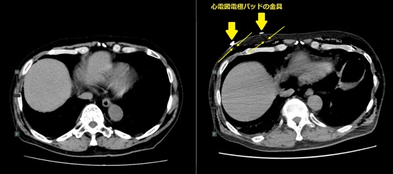 図2. 心電図電極パッドによりアーチファクトが写り込んでいるCT画像の例
